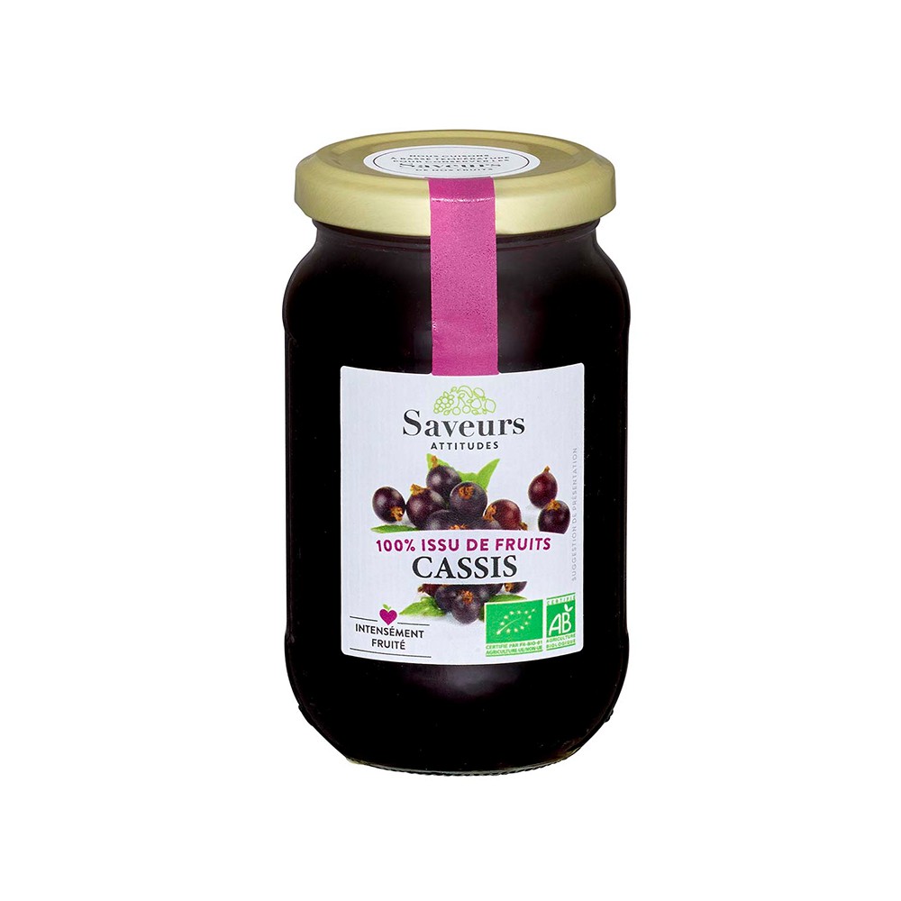 Ingrédients : Cassis* (55%), jus concentré de raisin rectifié*, gélifiant : pectine de fruits, lithothamne.